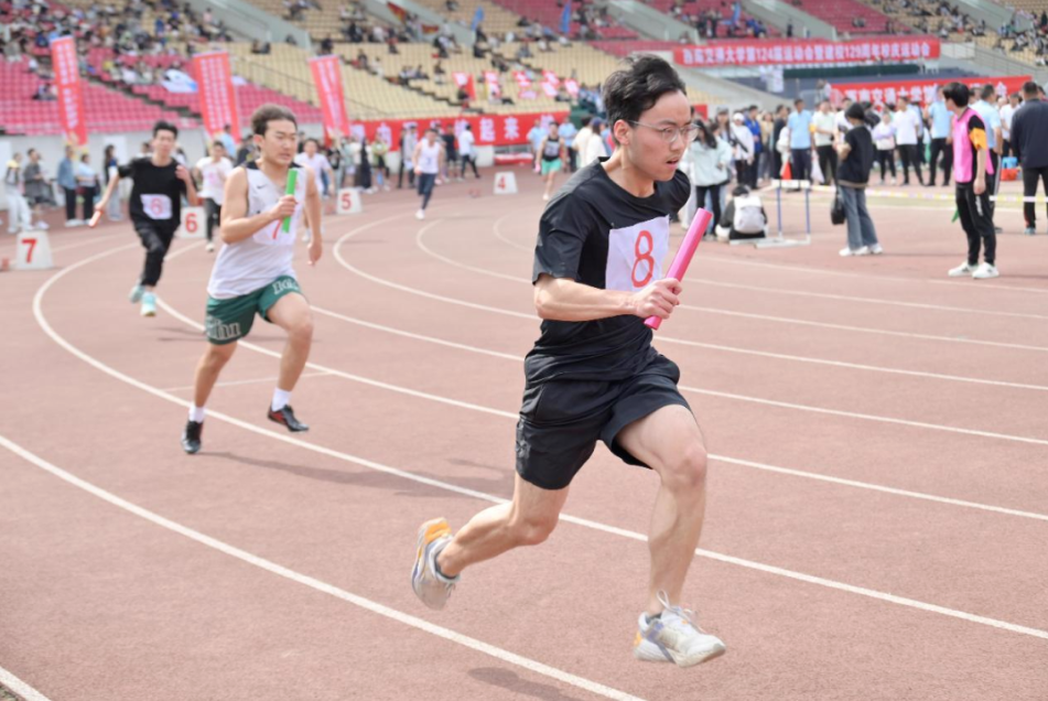 教工组的比赛同样精彩纷呈。老师们化身运动健将,在赛场上风驰电掣,展现出卓越的竞技水平与顽强的拼搏精神。他们默契的配合、坚定的眼神,成为同学们学习的榜样。在教工乙组 4×100 米接力赛中,张文、谢东、宾诚文和邱茂航老师携手奋战,荣获全校第五名;在教工乙组 200 米项目中,苏放老师一路领先,勇夺全校第三名,用实力诠释了 “硬核” 风采。