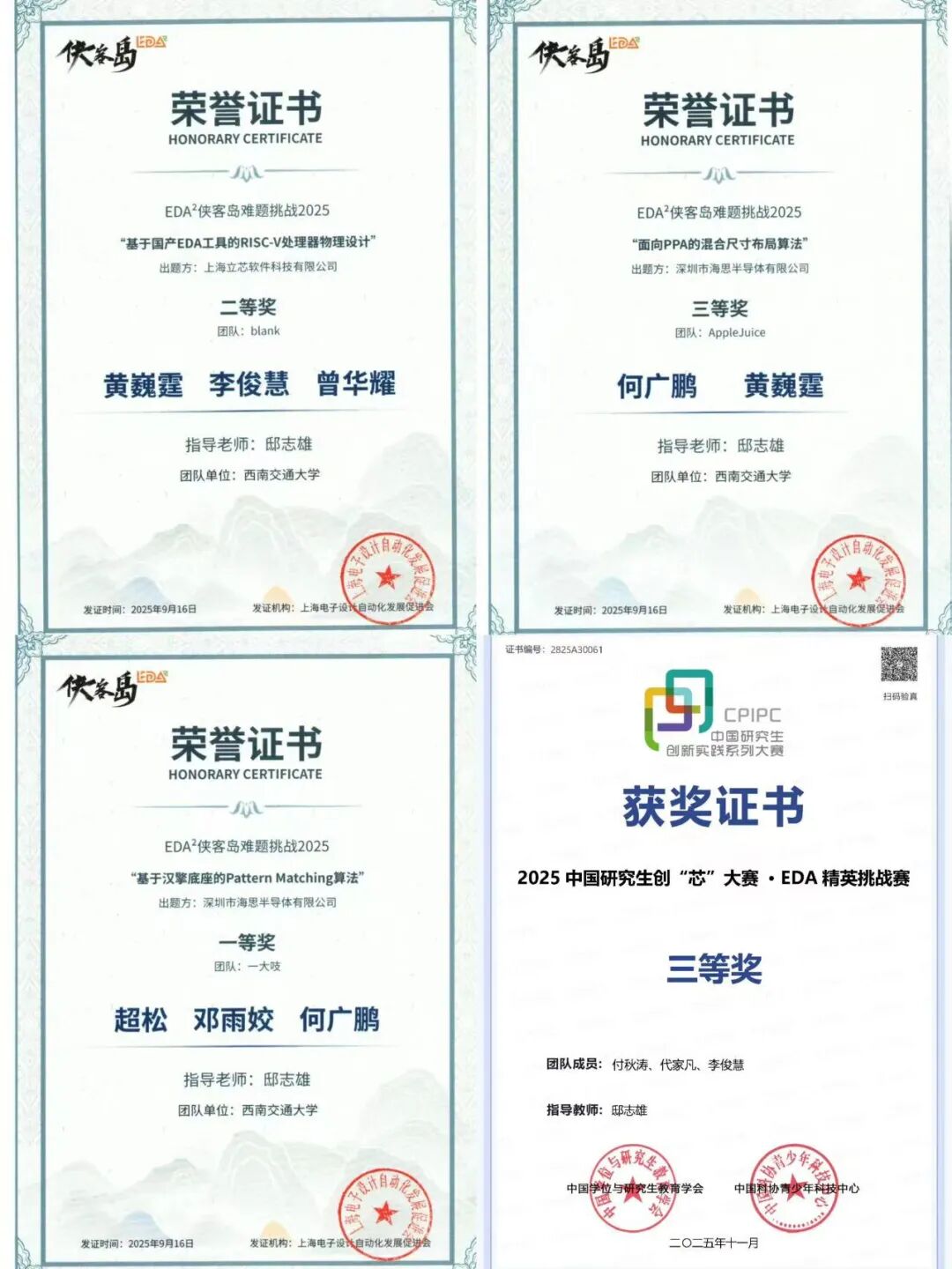 在2025年EDA²侠客岛难题挑战赛中,我院教师指导的研究生团队荣获多项奖励。其中“基于汉擎底座的Pattern Matching算法”难题获全国一等奖(全国第一名);“面向PPA的混合尺寸布局”难题获全国三等奖(全国第六名)。