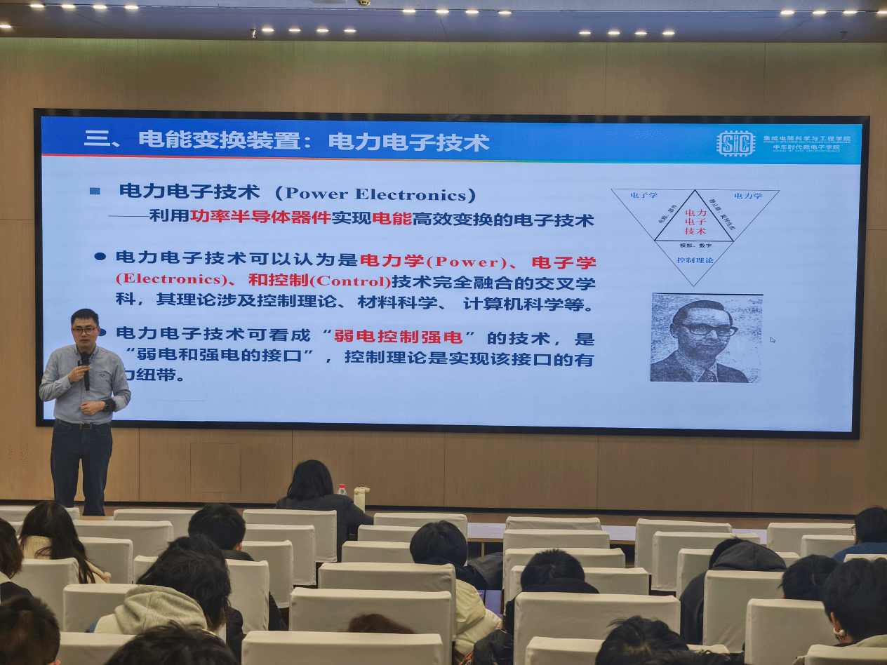 2025年12月16日上午,学院“‘芯’程启航‘芯’青年筑梦”系列讲堂第三期顺利举办。学院副院长宋文胜以“探索电能变换与功率半导体之美”为题,与同学们探索了功率半导体的核心技术逻辑,及其行业演进脉络与趋势。讲座由学院党委副书记王燕主持,全体2025级本科生参与。