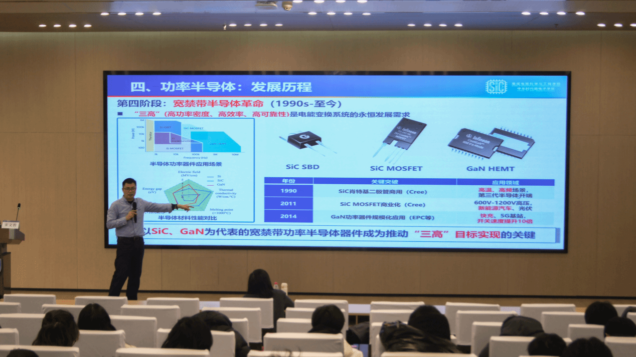 宋文胜指出,电力电子技术作为融合电力学、电子学与控制理论的交叉学科,以“利用功率半导体器件实现电能高效变换”为核心,凭借“以弱电控制强电”的特征,支撑着整流、逆变等关键装置在新能源发电、电动汽车、工业变频、数据中心供电等场景的广泛应用;功率半导体从1957年晶闸管开启固态时代,到全控型器件性能突破,再到碳化硅、氮化镓等第三代材料掀起高效率、高功率密度、高可靠性“三高”革命,其技术演进始终紧扣能源时代变革,成为驱动产业升级与能源转型的核心支撑。