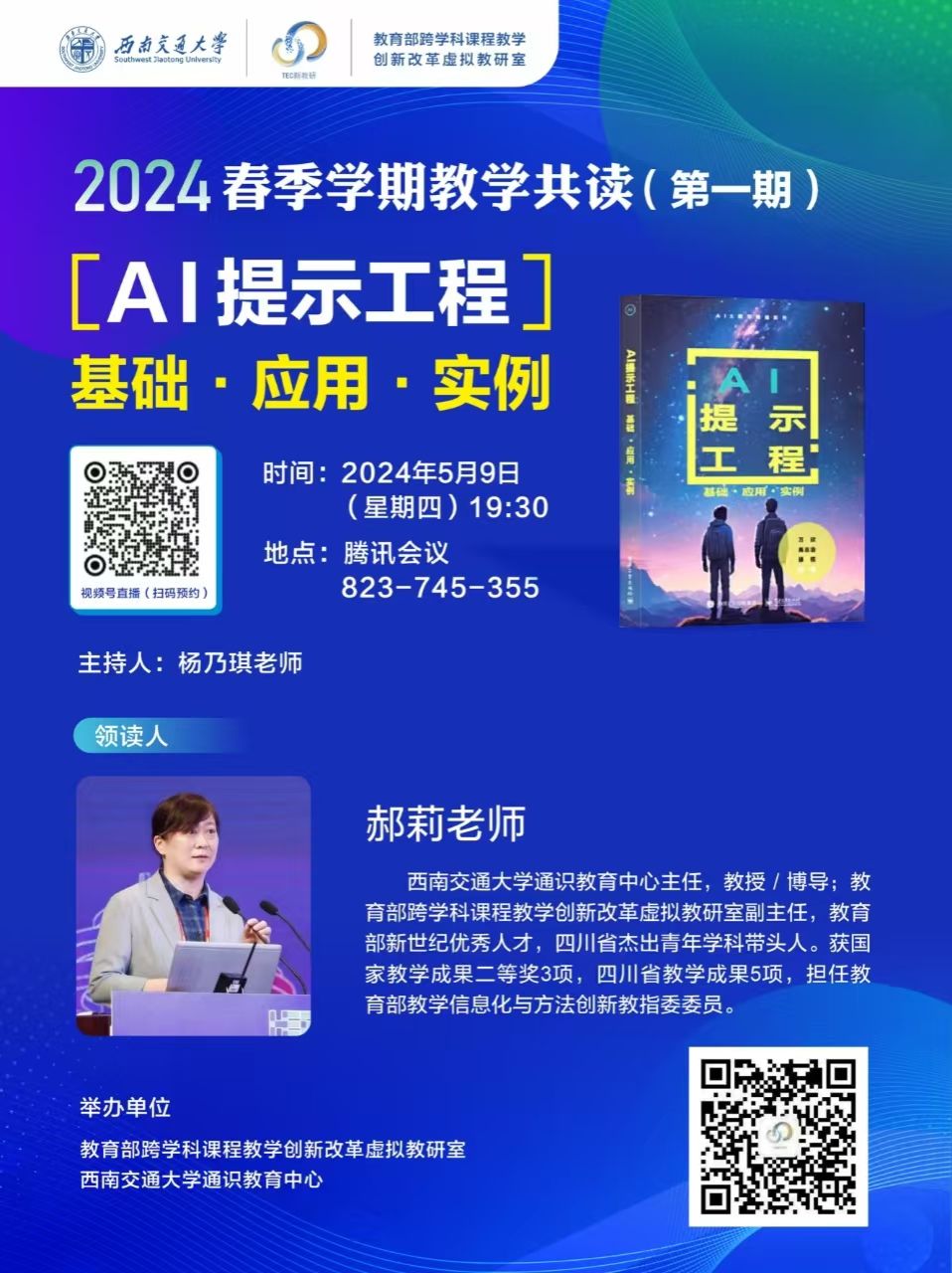 5月9日19:30, 2024春季学期教学共读活动(第一期)成功举办。51视频 郝莉老师领读《AI提示工程:基础·应用·实例》,为我们介绍了AI提示工程由基础到应用实例及后续更新发展的历程。教研室核心成员杨乃琪老师主持共读活动。